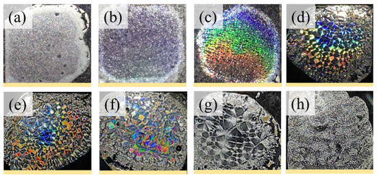 Next, the iridescent properties of the periodically banded PTT crystals (at Tc = 90–190 ℃) were tested using in-house setups. Figure 7 shows representative iridescent patterns of neat PTT films, where, in Figure 7a,b, it can be observed that the morphology of two ringless PET spherulites at 90 °C or 100 °C that do not produce photonic reflection due to the lack of an orderly structure. By contrast, for the inter-band spacing = 4 µm–15 µm, the interference coloration becomes the most intensely visible (Figure 7c–f) for PTT films crystallized at Tc = 140, 150, 160, and 165 °C, respectively. The iridescent properties are only supported by a ring-banded structural morphology. On the one hand, the color variations are observed by starting with a soft hue color for PTT with a borderline banding morphology, which can intensify upon refinement of the band regularity. In order to magnify this effect, the inter-band spacing of the PTT spherulites were custom adjusted by varying the Tc. On the other hand, the regular ring-banded morphology with large inter-band spacing (ca. ~40 µm) at Tc = 175 °C does not produce iridescence (Figure 7g). Likewise, for the ringless PTT spherulites packed with radial lamellae splashing from a central nucleus, the absence of an orderly structure makes it unable to produce iridescent coloration (Figure 7h).