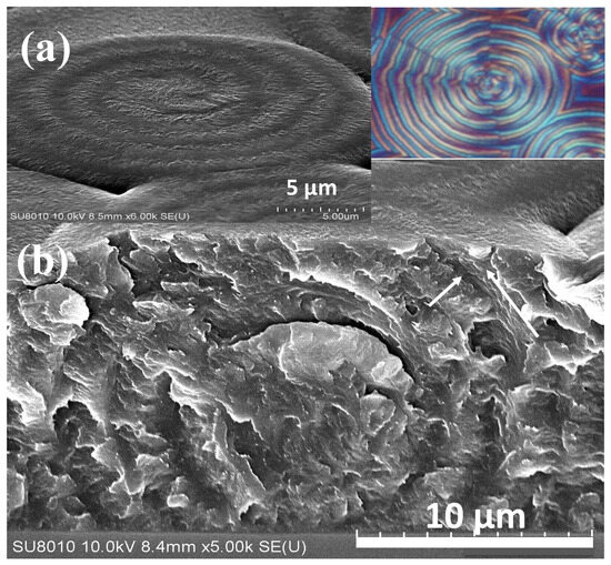 SEM micrograph (inset upper right for POM) for (a) the top surface with spiral-spin rings originating from a nucleus center and (b) the interior banded POT crystals at Tc = 105 °C, fracture across the nucleus, exposing grating onion-like spheroid layers, the white arrow revealing radial and tangential orientation.