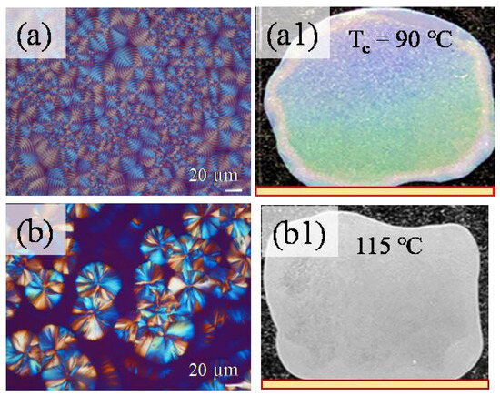(a,b) POM band patterns with (a1,b1) iridescence in orderly vs. corrupted bands in POT films crystallized at Tc = 90 vs. 115 °C, respectively. Scale bar in POM = 20 μm. Yellow scale bar in images = 18 mm.