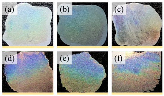 Subsequently, photonic reflection was observed on neat PNT as shown in Figure 10a–f, displaying the iridescent features of PNT films at Tc = 55, 65, 70, 75, 80, and 85 °C, respectively. The coloration intensity begins as a soft hue and gradually increases as the crystallization temperature increases. The most intense color occurs in PNT crystallized from 70 °C to 85 °C. From the PNT-banded spherulites, these periodic hierarchical lamellae with perpendicular orientations create an orderly microstructure suitable for interference with light. The similar regularity of these two types of banded patterns facilitates the iridescent properties in PNT crystals [59].
