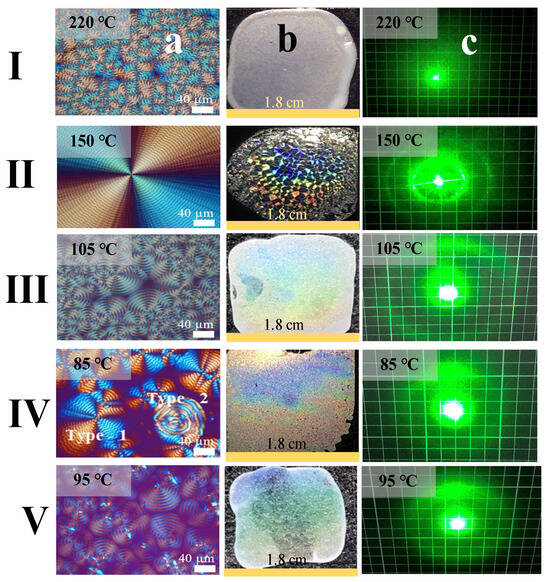 Comparison of POM graphs, iridescent photos, laser diffraction of several homologous aryl polyesters, Columns: (a) POM; (b) iridescent properties; (c) laser diffraction, in Rows: (I) PET; (II) PTT; (III) POT; (IV) PNT; (V) PDT.