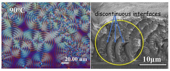 The interior assembly of POT is further analyzed and expounded in this work using similar techniques. To further expound the assembly in greater details, the correlation between the top-banding pattern and interior structure of neat POT is depicted in Figure 8a,b for the top-surface rings and fractured interiors neatly packed with orderly layers, respectively. White arrows in the figure are used to mark the alternate lamellar orientations with perpendicular intersections and interfaces between the onion-like layers. This optimum height difference between the periodic ridge and valley produces substantial light interference under these conditions. As the temperature increases, the POT spherulites’ patterns change systematically. Between crystallization temperatures of 85 °C and 105 °C, distinct ring-banded spherulites with assembly order are visible. It appears that the radii of the spherulites and inter-band spacing increase proportionately with increases in Tc. In summary, POT has a grating-like architecture, and the top surfaces and internal lamellar arrangements of banded POT are responsible for the occurrence of periodic changes in the optical interference—viewed as alternate colored circular rings with a lambda-tint plate in POM [58].