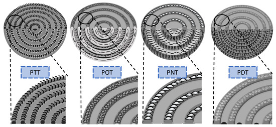 By comparing the crystal morphology, surface relief pattern, interior lamellar assembly, and iridescent properties in each of the periodic patterns of various aryl polyesters, it is clear that only PET is not capable of producing structural coloration. This is consistent with numerous publications [34,35] which have stated that neat PET cannot form regular ring-banded morphology under various thermal conditions as well as the orderly arrays from the top and interior surfaces. The remaining four polyesters, i.e., PTT, POT, PNT, and PDT, can form ring-banded spherulites with their unique properties. The top surfaces and internal crystal plate assemblies were thoroughly analyzed, and the results indicated that the aforementioned polyesters could form hierarchical structures with ordered lamellar arrays.