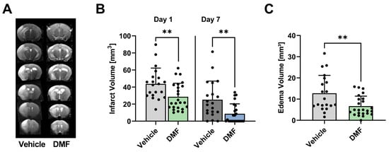 In the first series of experiments, we assessed the infarct size and perifocal edema extent in DMF- and vehicle-treated animals (controls) following transient middle cerebral artery occlusion (tMCAO). Infarct volumes were measured using planimetry of T2-weighted (T2w) MRI scans (Figure 1A). After tMCAO, DMF-treated mice exhibited significantly smaller infarct volumes compared to control animals on day 1 (mean infarct volume 43.7 ± 18.5 mm3 vs. 28.6 ± 15.9 mm3; p < 0.01) and on day 7 (mean infarct volume 25.2 ± 21.9 mm3 vs. 8.7 ± 11.6 mm3; p < 0.01) (Figure 1B). Furthermore, DMF treatment significantly reduced the development of infarct-induced brain edema on day 1 after tMCAO compared to controls (Figure 1C).