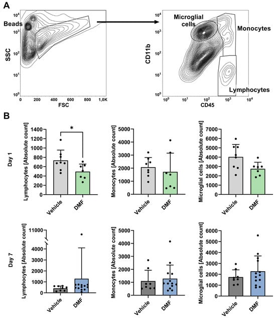 Immune cell recruitment to the ischemic brain hemisphere on days 1 and 7 after induction of tMCAO. Flow cytometric analysis of lymphocytes, monocytes, and microglial cells in the ischemic brains of vehicle- and DMF-treated animals. (A) Gating strategy for the flow cytometric evaluation of recruited immune cells. Representative contour plot refining the counting bead population and indicating a preselection of infiltrating immune cells into the ischemic hemisphere within the FSC and SSC plot (left). The gates defining the lymphocyte, monocyte, and microglial cell populations are shown within the CD45 and CD11b contour plot (right). (B) Absolute immune cell numbers within the ischemic brain on day 1 (n = 7–8/group) and day 7 after tMCAO (n = 8–13/group). Lymphocyte cell numbers were significantly reduced in DMF-treated animals compared to controls (vehicle) on day 1, but not on day 7 after tMCAO. Monocyte and microglial cell numbers did not differ between treatment groups on either day (day 1: n = 7–8/group; day 7: n = 8–13/group). * p < 0.05; two-tailed Mann–Whitney test.