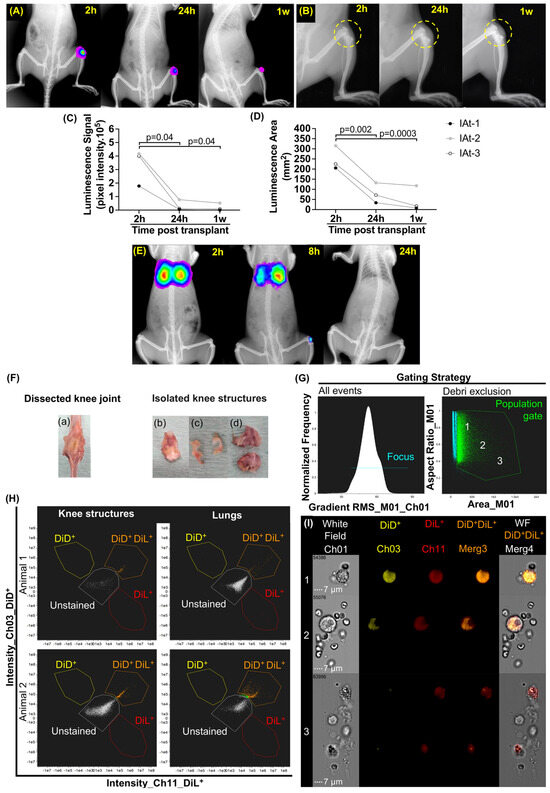 In vivo bioluminescence tracking of mesenchymal stromal cells (MSCs) at two (2 h), eight (8 h), and 24 hours (24 h), up to one week (1 w) after transplantation, along with ex vivo identification of double positive (DiL+ DiD+) MSC events through imaging flow cytometry (IFC), conducted at 12 h after intravenous transplantation. (A) Intra-articular transplant (IAt) of MSCs, and cellular bioluminescent signal represented in rainbow scale. (B) Knee joint (yellow dashed circle) and swelling after IAt. (C,D) Quantification of pixel intensity and luminescence area for IAt. (E) Intravenous transplant (IVt) in vivo of MSCs, and cellular bioluminescent signal represented in rainbow scale [26]. (F) Dissected knee joint: (a) anterior view; (b) knee structures containing synovial membrane, Hoffa fat pad, patella, and patellar tendon; (c) menisci; (d) femur and tibial cartilage with attached subchondral bone. (G) Gating strategy: population gate (green line) and image sampling zones 1, 2 and 3. (H) Dot plot of double positive events (orange dots) in lungs and DMM–OA-pooled knee structures. (I) Images of labeled cell morphology inside the gate according to zones 1, 2 and 3 (60× objective lens). White dotted line: 7 μm scale bar. IFC channels of labeled MSCs: DiD+ (yellow); DiL+ (red); DiL+ and DiD+ merge (orange). Brackets indicate comparisons and the respective p-values.