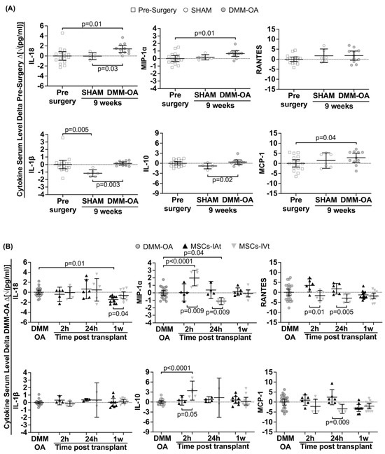 Animal model immunomodulation at pre-surgery and 9 weeks post-surgery, and acute immunomodulation at two (2 h) and 24 h (24 h), up to one week (1 w) after mesenchymal stromal cells (MSCs) intra-articular (IAt) or intravenous (IVt) transplantation. The serum levels of cytokines/chemokines were measured using a multiplex bead assay. The horizontal dotted line represents the average serum levels in the control group for two specific time points: (A) pre-surgery; (B) 9 weeks post DMM–OA surgery. The data are expressed as the delta between the control and intervention groups. Brackets indicate comparisons and the respective p-values.