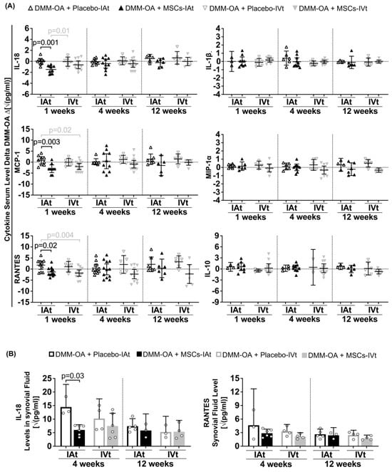 Long-term immunomodulation at one (1 w), four (4 w), and 12 weeks (12 w) after mesenchymal stromal cells (MSCs) intra-articular (IAt) or intravenous (IVt) transplantation. (A) Serum and (B) synovial fluid levels of cytokines/chemokines measured using a multiplex bead assay. For serum analysis, the horizontal dotted line represents the average serum level of each group average at 9 weeks after DMM–OA surgery (positive control). The data are expressed as the delta between the positive control and intervention groups. Vertical dashed lines separate comparisons at different time points. Black brackets indicate comparisons between IAt vs. IAt or IVt vs. IVt, while grey brackets represent comparisons between IAt vs. IVt. Statistical p-value is shown above the respective bracket.