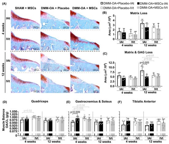 The ratio between DMM–OA and the contralateral leg’s muscle weight was analyzed as an indirect measure of limb functionality. At both 4 and 12 weeks, there were no significant differences between MSCs-treated groups and the placebo groups in terms of quadriceps muscle balance. However, it is worth noting that placebo-IAt showed a lower balance than placebo-IVt up to the 4 week mark. In the case of gastrocnemius and soleus muscles, MSC-IAt group exhibited a greater balance compared to placebo-IAt. Additionally, placebo-IVt and MSCs-IVt also demonstrated greater balance than placebo-IAt at 4 weeks but not 12 weeks (Figure 4D,E). No significant differences were observed in the tibialis anterior muscle (Figure 4F) or SHAM groups at 4 or 12 weeks (Figure S6D–F).