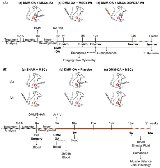 Experimental design. (A) To track the fate of transplanted MSCs in rats with DMM–OA-afflicted knees: (a) MSCs were intra-articularly transplanted (IAt) (2 × 106 cells/kg per body weight (bw) in 50 µL PBS) administered medially to the knee patellar ligament; (b) MSCs (4 × 106 cells/kgbw) were intravenously transplanted (IVt) via caudal vein and their homing to the knee with DMM–OA (the site of inflammation) was tracked via bioluminescence imaging at 2, 8, and 24 h and 1 wk. (c) In a separate experiment, MSCs (4 × 106 cells/kgbw) labeled with DiL and DiD lipophilic tracers (Molecular Probes, Invitrogen®) were injected via IVt, and animals were euthanized 12 h post-IVt. Subsequently, joint and lung tissue were harvested to isolate MSCs, and their fluorescence was monitored via imaging flow cytometry. (B) Examination of the effect of MSCs administered via IAt or IVt on DMM–OA. (a) MSCs were administered via IAt or IVt in rats with SHAM surgery. (b) As placebo, PBS alone was administered via IAt or IVt in rats with DMM–OA. (c) MSCs were administered via IAt or IVt in rats with DMM–OA as a treatment. All rats were bled via gingival vein prior to DMM surgery, 9 weeks following the induction of DMM–OA, and 2 and 24 h and 1 week following IAt or IVt. Four and 12 weeks following IVt or IAt, all rats were bled, synovial fluid collected, they were euthanized, and muscle and joints harvested for analysis. Red filled circles: DMM surgery; red open circles: SHAM surgery.