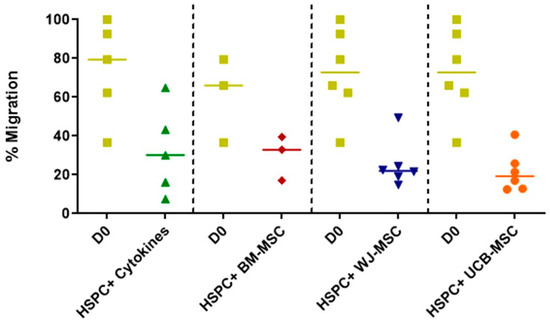 2.4. Evaluation of the Migratory Profile of Hematopoietic Stem and Progenitor Cells in Co-Culture with Mesenchymal Stromal Cells from Perinatal Tissues