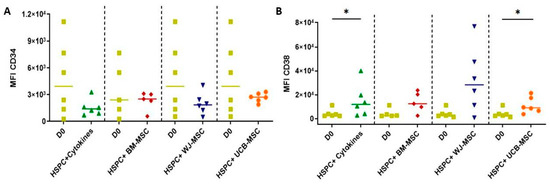 2.5. Determination of the Expression of Primitive and Lineage-Committed Markers in Hematopoietic Stem Progenitor Cells Cultured with Mesenchymal Stromal Cells from Perinatal Tissues