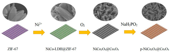 The design strategy of p-NiCo2O4@Co3O4 is shown in Figure 1. First, ZIF-67 was deposited on the surface of foam nickel. Then we used Ni(NO3)2 solution for ion etching. This process was mainly controlled by the hydrolysis of Ni(NO3)2. Due to the weak alkalinity of the ligand, ZIF-67 reacted with the H+ produced by hydrolysis, releasing Co2+. The generated Co2+ was partially oxidized by NO3− to Co3+. Then, Co2+/Co3+ diffused outward and co precipitated with Ni2+ on the ZIF-67 surface to form NiCo-LDH, thereby forming NiCo-LDH@ZIF-67 core shell structure.