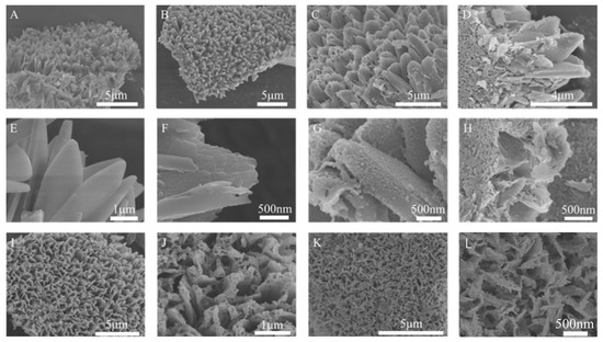 SEM images of (A,E) ZIF-67; (B,F) NiCo-LDH@ZIF-67-5; (C,G) NiCo-LDH@ZIF-67-10; (D,H) NiCo-LDH@ZIF-67-15; (I,J) NiCo2O4@Co3O4; and (K,L) P-NiCo2O4@Co3O4-2.