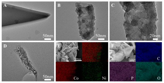 TEM images of the ZIF-67 (A); NiCo-LDH@CoMOF-10 ((B,C) is the enlarged image); P-NiCo2O4@Co3O4-2 (D); SEM element mapping images of NiCo2O4@Co3O4 (E); and P-NiCo2O4@Co3O4-2 (F).