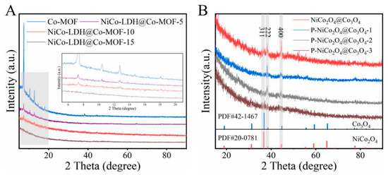 (A) The XRD patterns of ZIF-67, NiCo-LDH@ZIF-67-5, NiCo-LDH@ZIF-67-10, and NiCoLDH@ZIF-67-15. (B) The XRD patterns of NiCo2O4@Co3O4, P-NiCo2O4@Co3O4-1, P-NiCo2O4@Co3O4-2, and P-NiCo2O4@Co3O4-3.