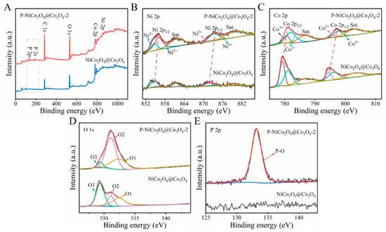XPS spectrum of P-NiCo2O4@Co3O4-2 and NiCo2O4@Co3O4: (A) survey spectrum; (B) Ni 2p; (C) Co 1s; (D) O 1s; and (E) P 2p.