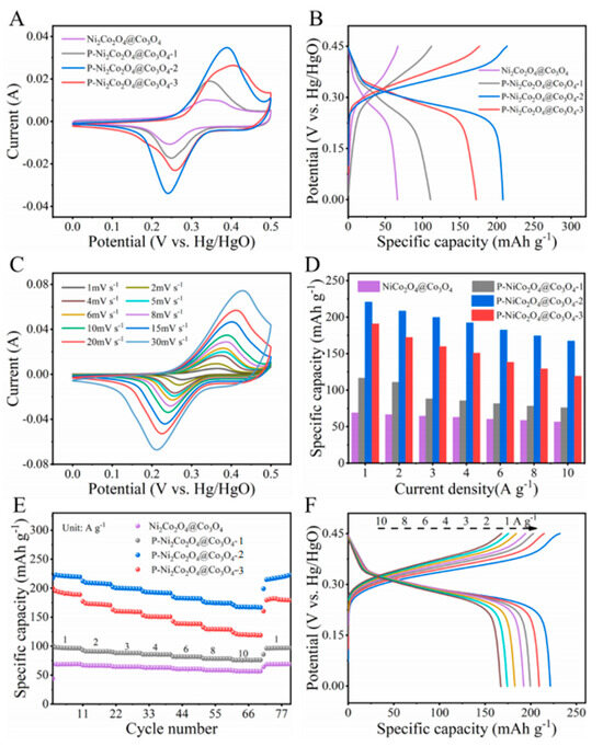 The CV curves of NiCo2O4@Co3O4, P-NiCo2O4@Co3O4-1, P-NiCo2O4@Co3O4-2, and P-NiCo2O4@Co3O4-3 in a three electrode system in 5 M KOH solution at a scanning rate of 10 mV s−1 are shown in Figure 6A, and all samples exhibit a pair of redox peaks, which can be attributed to the reversible Faraday conversion process of MO and MOOH (M=Co, Ni) in an alkaline electrolyte [24]. The GCD curves (Figure 6B) of four samples at a current density of 2 A g−1 all exhibit a charge–discharge plateau at the corresponding potential windows, which is consistent with the CV curve [25]. The peak current and integral area of the CV curves of the three phosphating treated samples are greater than that of the untreated sample NiCo2O4@Co3O4, which is consistent with the capacity relationship of the GCD curves, indicating that phosphating treatment greatly improves the electrochemical activity of the electrode material [26]. Among them, the integrated area of P-NiCo2O4@Co3O4-2 is the largest, and the maximum specific capacity reaches 209 mAh g−1. The CV curve shapes (Figure 6C) of P-NiCo2O4@Co3O4-2 at different scan rates (1–30 mV s−1) remain almost unchanged as the scan rate increases, indicating that the material possesses excellent rate performance and reversibility.