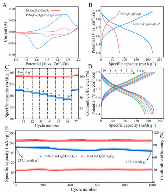 (A) CV curves at 15 mV s−1; (B) GCD curves at 3 A g−1 of P-NiCo2O4@Co3O4-2//Zn and NiCo2O4@Co3O4//Zn; (C) rate performance; (D) GCD curves of P-NiCo2O4@Co3O4-2//Zn with current density from 1 to 10 A g−1; and (E) Cycling performance of P-NiCo2O4@Co3O4-2//Zn and NiCo2O4@Co3O4//Zn at 3A g−1, the interwoven blue and red lines in the upper part of the figure is the Coulomb efficiency curve.