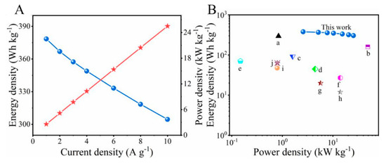 (A) Power density(red star) and energy density(blue ball) of P-NiCo2O4@Co3O4-2//Zn at different current densities and (B) Ragone plot of P-NiCo2O4@Co3O4-2//Zn, the details of a, b, c, d, e, f, g, h, i and j are given in Table 1, respectively.