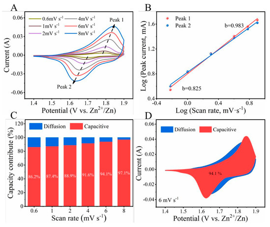 In order to investigate the electrochemical kinetics behavior of the P-NiCo2O4@Co3O4-2//Zn battery, CV curves were obtained at 0.6, 1, 2, 4, 6, and 8 mV s−1 within the potential window between 1.4 and 1.9 V. Figure 9A exhibits that the redox peaks shift but the CV curves did not show significant deformation, remaining highly reversible with the increase in scan rates. Normally, the Dunn power law relationship, i = avb, is used to analyze the surface capacitive and diffusion-controlled processes of a battery, where i is the peak current, v is the scan rate, and a and b are adjustable parameters. The b value of the oxidation peak of the P-NiCo2O4@Co3O4-2//Zn battery is 0.983, and the reduction peak is 0.825, indicating that the charge storage process belongs to a mixed control process, which includes both diffusion control behavior and capacitance control behavior. But the value of b is closer to one, indicating that capacitor control dominates the charge storage process.