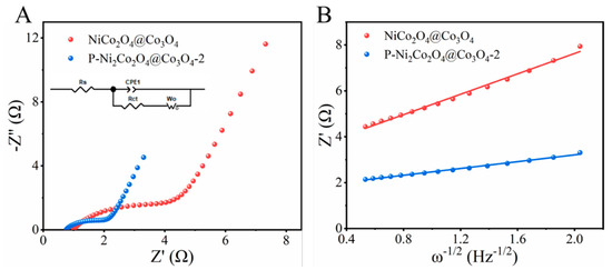 (A) Nyquist plots of NiCo2O4@Co3O4//Zn and P-NiCo2O4@Co3O4-2//Zn (inset is the electrical equivalent circuit) and (B) the linear relationships between Z′ and ω−1/2 of the NiCo2O4@Co3O4//Zn and P-NiCo2O4@Co3O4-2//Zn in the low-frequency region.