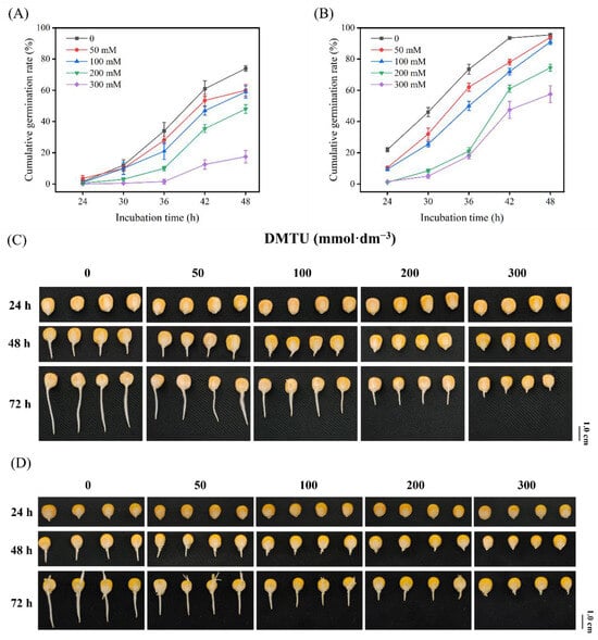 The maize seeds tested, Zhengdan 958 (Zea mays L. cv. ZD958, dent maize) and Demeiya 1 (Zea mays L. cv. DMY1, flint maize), were used as test maize varieties, and uniform and consistent seeds for each variety (40 and 27 g per 100 seeds for ZD958 and DMY1, respectively) were selected. Before experimentation, all seeds underwent 1% NaClO sterilization for 20 min, 75% (v/v) ethanol surface sterilization for 60 s, and six sterile water rinses. Subsequently, the seeds, after surface sterilization, were placed in a paper bed germination box (length × width × height: 14 cm × 14 cm × 6 cm) with 10 mL of sterile water containing 0, 50, 100, 200, and 300 mmol·dm−3 DMTU, and incubated in an artificial climate chamber (DRX-1000, Ningbo Dongnan Instrument Co., Ltd., Ningbo, China) in the dark (temperature 25 ± 0.5 °C, relative humidity 50 ± 5). Four replicates were used for each treatment, with each germination box serving as a single replicate. The dynamics of seed germination (radicles breaking through the seed coat of seeds) treated with different concentrations of DMTU were observed, and each 6 h span was calculated to determine the cumulative germination rate within 48 h. A stereoscopic zoom microscope system (Ste REO Discovery V8, Carl Zeiss AG, Oberkochen, Germany) was used at different time points to observe each treatment condition.