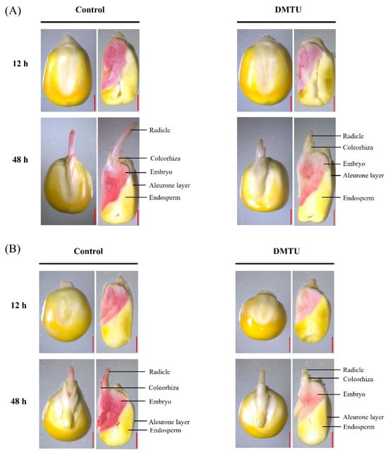 Different times of staining of maize seed with 2,3,5-triphenyltetrazolium chloride (TTC) in sterile water and ROS scavenger (DMTU). ZD958 (A) and DMY1 (B) were incubated in sterile water (control) or ROS scavenger (DMTU) for 12 or 48 h. We stained complete seeds or half of the seeds with 2,3,5-triphenyltetrazolium chloride (TTC) in both varieties. Dark red staining indicates high cell or tissue viability, whereas light pink staining indicates low cell or tissue viability. DMTU—N,N′-dimethylthiourea. Scale bar, 100 µm.