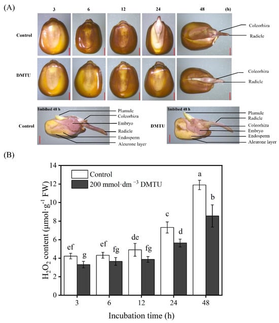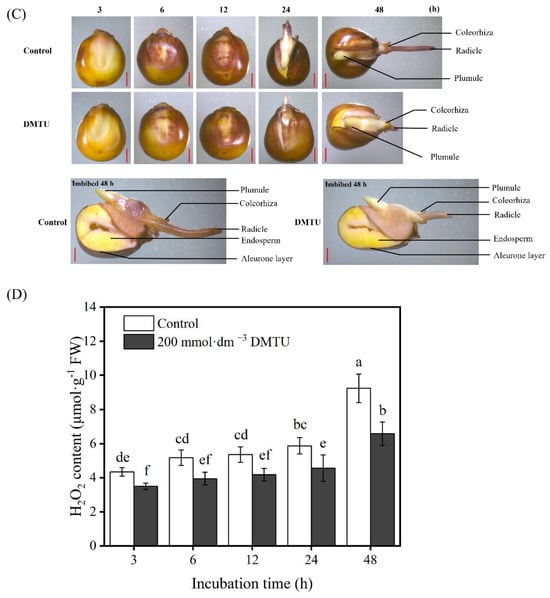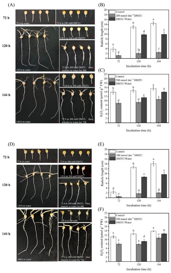 Therefore, for incubation for 72, 120, and 144 h, we measured the length of the ZD958 and DMY1 radicles simultaneously. According to Figure 4B,C,E,F, when ZD958 and DMY1 were cultured in sterile water, the length of the radicle gradually increased with time, reaching its maximum value after 144 h of incubation, which was 14.45 cm and 14.07 cm, respectively; furthermore, the H2O2 content remained high. However, when maize seeds were cultured under DMTU conditions of 0 mmol·dm−3 DMTU, radicle elongation and growth were significantly inhibited (p < 0.05) in both ZD958 and DMY1. At 144 h of incubation, the radicle lengths of ZD958 and DMY1 were only 2.53 cm and 2.08 cm, and the H2O2 content was also significantly lower (p < 0.05) than in sterile water culture conditions. However, when the maize seeds incubated under DMTU conditions for 72 h were transferred to sterile water for further cultivation, the radicle gradually resumed to elongate and grow, and the radicle length of ZD958 and DMY1 reached 9.92 cm and 9.68 cm at 144 h, respectively. When the radicle was transferred from DMTU to sterile water for cultivation, the H2O2 content in the radicle increased rapidly, which was consistent with the morphological changes. Thus, results show that DMTU can inhibit radicle elongation and growth during maize seed germination by specifically removing H2O2 from the seeds.