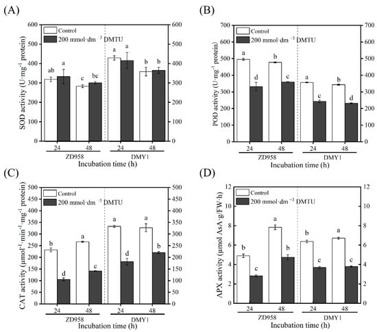 Antioxidant enzyme activity of maize seeds after 24 and 48 h of incubation with sterile water and ROS scavenger (DMTU). The ZD958 and DMY1 seed embryos incubated in sterile water (control) or ROS scavenger (DMTU) for 24 and 48 h demonstrated SOD (A), POD (B), CAT (C), and APX (D) activities. Data are the mean standard deviation of five embryos (about 0.1 g) from four replicates. Between treatments and incubation durations, there were significant differences in the mean of different letters (p < 0.05). FW—fresh weight. DMTU—N,N-dimethylthiourea; SOD—superoxide dismutase; POD—peroxidase; CAT—catalase; APX—ascorbate peroxidase.