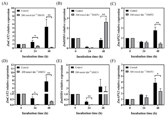 ZmSOD4, ZmCAT2, and ZmAPX2 expression levels in seeds of maize after 24 and 48 h of ROS scavenger (DMTU) and sterile water incubation. Expression levels of ZmCAT2 in ZD958 (A) and DMY1 (D) seed embryos were determined after incubation in sterile water (control) and ROS scavenger (DMTU) for 24 and 48 h, respectively. The expression levels of ZmSOD4 in ZD958 (B) and DMY1 (E) seed embryos were determined after incubation in sterile water (control) and ROS scavenger (DMTU) for 24 and 48 h, respectively. Expression levels of ZmAPX2 in ZD958 (C) and DMY1 (F) seed embryos were determined after incubation in sterile water (control) and ROS scavenger (DMTU) for 24 and 48 h, respectively. Data are presented as the mean ± standard deviation of five embryos (about 0.1 g) from four replicates. Using the Student’s t-test, we assessed whether there were significant differences between the 24 and 48 h qPCR results and the 0 h qPCR data (* p < 0.05; ** p < 0.01). DMTU—N,N-dimethylthiourea.