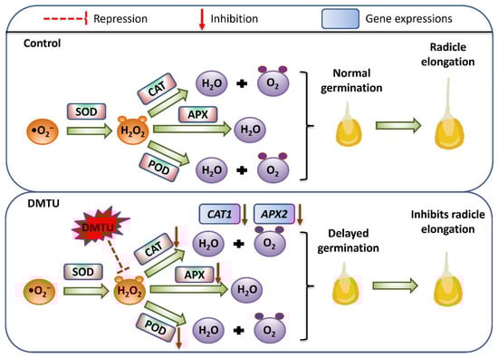 A model showing the endogenous scavenging of H2O2 by DMTU during maize seed germination using sterile water (control) and ROS scavenger (DMTU). H2O2—hydrogen peroxide; •O2−—superoxide anion; SOD—superoxide dismutase; POD—peroxidase; CAT—catalase; APX—ascorbate peroxidase.