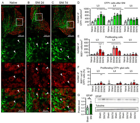GFAP is a commonly used marker to study the reactivity of SGCs in neuropathic pain models [5,25,26]. In the neuronal soma-rich regions in the DRG, we found that the number of CFP+ cells doubles by the 2nd day after SNI and remained elevated at 4 and 7 days post-SNI (Figure 2A–D). Interestingly, the increase in CFP+ cells is not accompanied by their proliferation after SNI (Figure 2A–C,F). Ki67 marks the nucleus at all the active proliferation phases in the cell cycle, but it is absent from cells in the resting phase [34]. While the total expression of Ki67 is increased in the DRG after SNI, it is not significantly expressed in CFP+ cells; <1% of CFP+ cells co-localise with Ki67 staining (Figure 2A–C,E,F). We also observed the upregulation of GFAP protein in the L3-L5 DRG, compared to sham mice (Figure 2G).