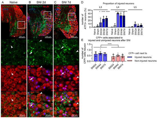 The increase in CFP signal occurred in the L3 and L4 DRG, which contained about 21.5% ± 9.9 S.D. and 36.5% ± 7.8 S.D. of activating transcription factor 3 (ATF3+) injured neurons, respectively (Figure 3A–D). The L5 DRG contained mainly uninjured neurons from the spared sural nerve; therefore, it expressed a negligible amount of ATF3 (activating transcription factor 3) in neurons after SNI (6.6% ± 4.5 S.D.). The percentage values of ATF3+ neurons were calculated based on NeuN staining. In addition, CFP+ cells were found more often close to ATF3+ injured neurons, rather than ATF3− uninjured neurons in the L3 and L4 DRG at 2, 4 and 7 days after SNI (Figure 3E).
