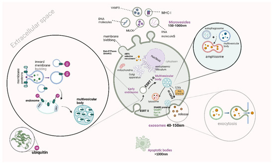 Exosomes are the smallest subclass of EVs (40–150 nm), which are produced via a distinct biogenetic pathway that is initiated with the inward budding of the plasma membrane [17,18]. More particularly, several transmembrane proteins are internalized, under the effect of the endoplasmic network, which is followed by the formation of vesicles that are further split from the cell membrane. Afterward, early endosomes are formed, after being integrated with the aforementioned vesicles, and then are further matured into late endosomes. The internalized molecules can be either transferred back to the plasma membrane or further led to intraluminal vesicles (ILVs). The formation of ILVs includes the invagination of several points of late endosomal membranes, while ILVs additionally form multivesicular bodies (MVBs), under the contribution of an endosomal sorting (ESCRT) complex [18,19]. This enzymatic complex is constituted by ESCRT 0, I–III, which has a pivotal role in the remodeling of the membrane, that finally leads to the formation of MVBs that is composed of several ILVs. More particularly, ESCRT-0 is required for the generation of ILVs, while ESCRT-I is further recruited and allows endosomal membrane budding. In addition, ESCRT-II later recruits ESCRT-III, which allows the separation of ILVs and their incorporation into MVB lumen [19,20]. Nevertheless, there is an alternative ESCRT-independent pathway of exosome generation, when the cargo recruitment arises from divergent sites like the cytoplasm, trans-Golgi complex, and membrane [21]. The last step for the exocytosis of exosomes in the extracellular space is mediated via the MVB integration in plasma membrane, under the involvement of VAMP7, syntaxin 1A (Syx1A), and Ykt6, which constitute a protein complex, the so-called soluble NSF attachment protein receptor (SNARE) proteins [22,23,24]. However, the aforementioned event is not the only pathway that MVBs follow, due to the fact that they can be directed towards lysosomal degradation or can interact with the autophagy pathway [25].