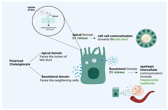 A schematic presentation of apical and basolateral secretion of EVs by polarized cholangiocytes and their targets. The polarized cholangiocytes release several EVs from their apical membrane region towards the bile duct and from their basolateral part towards hepatocytes and the capillaries around the intrahepatic ducts [43]. The apical EV release is implicated in cell–cell communication and induces several signaling pathways via EV uptake by cilia, while the basolateral EV release is implicated in upstream intercellular communication [43,44]. This figure was created with “BioRender.com”, accessed on 19 October 2023 (Agreement number XU25ZQ4AUV).