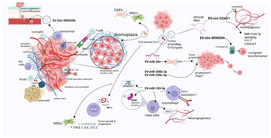 Some other sources of EVs that can modulate the CCA TME are HSCs and TAMs, more particularly, HSC-derived EVs that contain miR-195 as tumor suppressors, as they induce the inhibition of tumor growth and progression [84], while TAM-derived EVs containing circ-0020256 have a role as tumor promoters by increasing the proliferative, migratory, and metastatic behavior of the CCA cells [85]. In Table 1, we summarize the type of EV sources, cargoes, and their effect in TME, as well as their expression levels and role in CCA. Additionally, in Figure 3, we present a schematic presentation of the wide variety of TME components and tumor-promoting EV-cargoes that modulate CCA-TME (Agreement number RM25ZQJVSG).