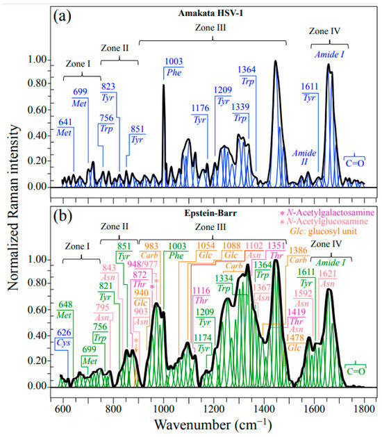 Tiwari et al. [80] have monitored the replication kinetics of EBV infection in glial cells by means of Raman spectroscopy. Those researchers located unique EBV Raman signals associated with specific biomolecules involved in viral duplication. Enrichment of glycogen polysaccharide, as spotted in cell nuclei upon progressing viral duplication, could be recognized by means of specific Raman fingerprints located in the spectral interval 850~1124 cm−1. This feature is indeed exactly matching one of the main spectroscopic characteristics that we report here for the examined EBV strain as a distinct one from the spectral characteristics of the HSV-1 strain.