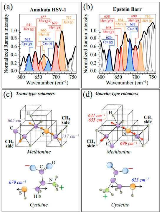 Average spectra in Zone I (600~750 cm−1) as recorded with high spectral resolution for HSV-1 (a) and EBV (b) samples. This zone is dominated by stretching of C–S bonds in different rotamers of S-containing amino acid residues (cf. abbreviations in text). Labels in inset give wavenumbers at maximum of sub-bands in units of cm−1. In (c,d), schematic drafts are given with the prominent vibrational modes methionine and cysteine molecules with trans and gauche symmetry, respectively.