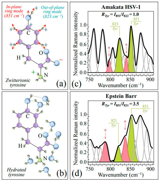 Schematic drafts and prominent vibrational modes of zwitterionic (a) and hydrated (b) tyrosine. In (c,d), average spectra in Zone II (750~900 cm−1) are given as recorded with high spectral resolution for HSV-1 (a) and EBV (b) samples. This zone contains signals from two specific ring vibrations of tyrosine residues, as shown in (a), from which the tyrosine ratio, RTyr = I851/I823, was computed (cf. values in inset). Asparagine molecules mainly contribute bands at 795 and 843 cm−1, labeled with asterisks.