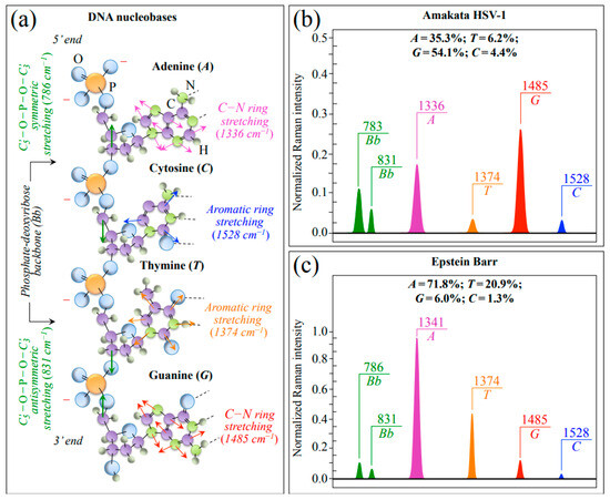 In addition to the most intense Raman signal from phenylalanine (Phe) at ~1003 cm−1 (symmetric ring breathing), Zone III also includes ring-related signals mainly assignable to DNA purine and pyrimidines. Bands representing stretching of heterocyclic aromatic rings that belong to pyrimidines can be found at 1528 and 1374 cm−1 for cytosine (C) and thymine (T), respectively [36,37,38,39]. Conversely, cumulative C–N stretching signals in imidazole and pyridine rings of purines can be found at 1336 and 1485 cm−1 for adenine (A) and guanine (G), respectively. [40] Two additional signals related to the DNA structure are found at ~786 and ~831 cm−1 (i.e., in Zone II; cf. Figure 3c,d). These latter signals arise from symmetric and antisymmetric stretching modes of C–O–P–O–C phosphodiester bonds in the phosphate-deoxyribose backbone (Bb), respectively [41]. Figure 4a shows a schematic draft of the linked structure of DNA nucleobases with the above-mentioned Raman spectroscopic fingerprints from purine and pyrimidine rings. In Figure 4b,c, Raman sub-bands from purine and pyrimidine nucleobases are extracted from average spectra in Figure 1 of HSV-1 and EBV, respectively. Nucleobase relative fractions computed from sub-band areas are given in inset to each figure. The comparison shows clear differences between the two virus samples, as expected from their different genomic structures (cf. labels in inset to Figure 4b,c). Despite some overlap in the EBV spectrum for the signal at 831 cm−1 with the NH2 out-of-plane bending band of Asn, signals representing the stretching modes of phosphodiester (backbone) bonds roughly maintain their relative intensity in both virus spectra as a sign of consistency in the Raman analysis (cf. Figure 4b,c) [28].