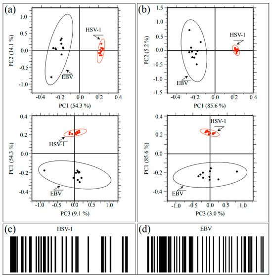 (a) Correlation matrix plots of PC2 vs. PC1 and PC1 vs. PC3 and (b) covariance matrix plots of the same principal components for both investigated herpesviruses. PC1 is mainly influenced by the relative intensity of the spectrum with respect to the point of normalization, while PC2 and PC3 directly relate to both glycomics and proteomics of the virions; (c,d) give the Raman barcodes computed from sub-band sequences collected on HSV-1 and EBV samples, respectively.