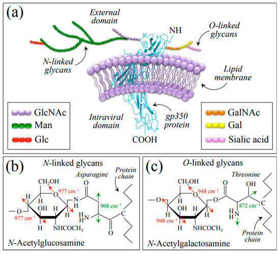 Understanding O-glycosylation in EBV at the molecular scale is crucial for developing strategies to combat EBV infection and related diseases, and research is ongoing to unravel the specific glycan structures involved, their functional significance, and the interplay between O-glycosylation and other viral and host factors in the context of EBV infection [65]. The present Raman study provides some new information about the vibrational modes of the glycosidic linkages, sugar ring structures, and related modifications present in the EBV glycans. Since the gp350 protein has extensive N- and O-linked oligosaccharide chains, the significant differences observed between the Raman spectra of EBV and HSV-1 are indeed due to the presence of a large number of O-glycosites distributed on the EBV envelope proteins. Figure 8a shows a schematic draft of the gp350 protein (re-drawn according to [66]) embedded in the outer lipid bilayer membrane and its neighborhood with related O-linked chains, which present N-acetylglucosamine (GlcNAc) and N-acetylgalactosamine (GalNAc) residues at N-linked and O-linked glycan chains, respectively. We have drawn the highly branched N-linked glycans covalently added on Asn residues (Figure 8b) and the O-linked glycans added on Thr residues (Figure 8c) according to the structure given by Wang et al. [67]. The following main spectroscopic features supported the adoption of this model: (i) the presence of a series of preponderant Raman bands mainly contributed by Asn and Thr, which were only found in the EBV spectrum (cf. Section 2.1, Figure 1 and Figure 8b,c with fingerprint vibrational modes for Asn and Thr labeled in inset) [32,33]; and (ii) the presence, only prominent in EBV, of two bands at 948 and 977 cm−1 (cf. deconvoluted bands labeled with asterisks in Figure 1b) traceable to C–O/C–C stretching in the glycosyl ring unit of N-GalNAc and N-GlcNAc, respectively (cf. fingerprint vibrational modes in Figure 8b,c as labeled in inset) [28,68].