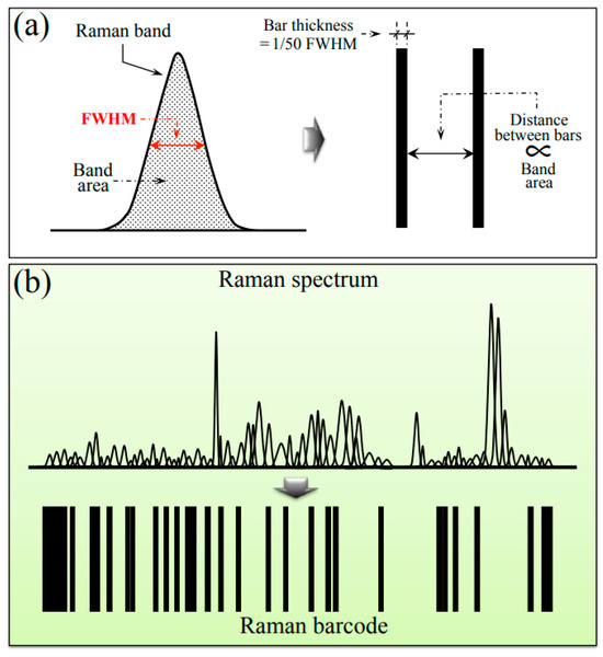 Barcodes were generated from deconvoluted Raman spectra using the respective sequences of Gaussian–Lorentzian sub-bands. Sub-band sequences were converted into barcodes by means of an algorithm that assigned to each band a line with thickness equal to 1/50 of the sub-band full width at half maximum and a distance from the successive line proportional to the sub-band area. The procedure of barcode construction is briefly explained in the draft of Figure 10a,b, which give the conversion of a single Raman sub-band into a bar and conversion of the entire spectrum into a barcode, respectively). The Raman barcode could enable efficient electronic recordkeeping and increase data accessibility by storing the structural characteristics of different sub-variants to be suitably converted into informative text through apps and user-friendly software.