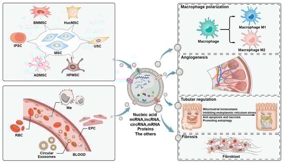 Cells of distinct types have been confirmed to secrete exosomes that may be significant in the onset and development of AKI, especially mesenchymal stem cells (MSCs). MSCs are derived from a wide range of sources, including bone marrow, adipose tissue, umbilical cord, human placenta, dental pulp, skin, blood, and urine, as well as from induced pluripotent stem cells (iPSCs) [17].