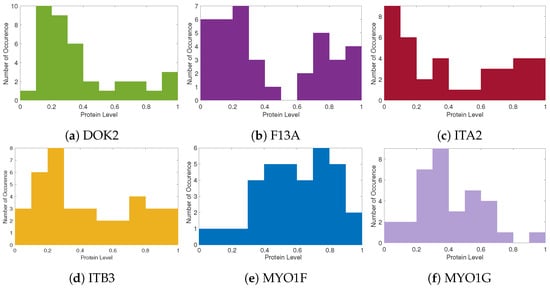 As part of the exploratory data analysis, the protein level data were first normalised using max–min normalisation. Then, the distributions of the top ten proteins were visualised through the histograms in Figure 2. These histograms form mixtures of distributions, which is an indicator of different patterns that are useful for patient stratification. It is evident that for most proteins, their distributions indicate that the statistical population contains two subpopulations, such as in the examples illustrated here, e.g., F13A (see Figure 2b) and MYO1F (see Figure 2e).
