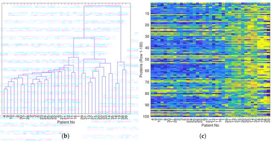 To verify these observations, we used a hierarchical distance-based clustering algorithm to create a dendrogram in Figure 3b. The dendrogram creates a hierarchical relational structure for the patients based on the average distances in their proteomic profiles. This is a different type of grouping than that used by the experts, which was based on chemosensitivity. Then, based on this grouping, we updated the heatmap following the ordering of the dendrogram leaves in Figure 3c. As is easily observed, the dendrogram has grouped patients 20 and 21 from Group 4 with patients from other groups. The same situation is seen for patients 16 and 17, who were grouped with patients from Groups 1 and 2. Based on these observations, an unsupervised ML approach is explored as a first step during patient stratification to relabel the patients based on their proteomic profiles.