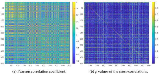 Cross-correlation and significance matrices of the first 500 proteins. (a) High Pearson correlation values (roughly ) indicate potential redundancies in terms of the usability of the proteins as features. (b) p values lower than 0.05 (dark blue) indicate significant correlations or not.