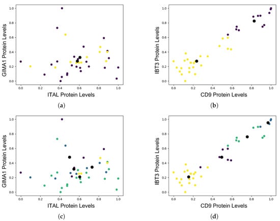 Clusters of varying numbers of patient groups with 37 features comparing feature ranking lists based on ANOVA p-values. The big black dots represent the centroid of the clusters. It is evident that the ranking based on our ANOVA was able to rank proteins that resulted in a clear clustering of the patients based on their proteomic profiles. (a) Clusters, 2; features, 37; [7] ranking. (b) Clusters, 2; features, 37; new ANOVA. (c) Clusters, 4; features, 37; [7] ranking. (d) Clusters, 4; Features, 37, new ANOVA.
