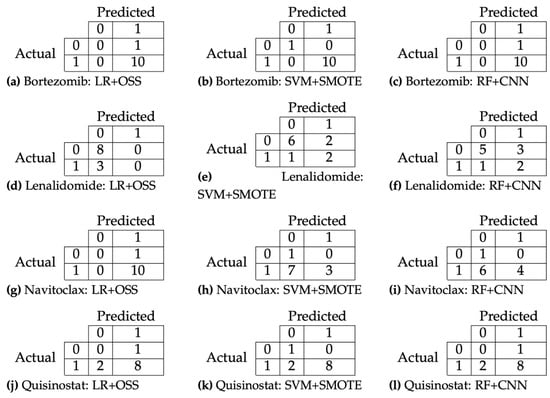 After applying a series of different data-balancing techniques [31], we tested them on several different ML techniques, such as linear regression (LR), support vector machines (SVMs), Random Forests (RFs), neural networks, and more. We found that the most promising models were LR with One-Sided Selection (henceforth called LR+OSS), SVM with Synthetic Minority Over-sampling Technique (henceforth called SVM+SMOTE), and RF with Condensed Nearest Neighbours (henceforth called RF+CNN), as reported in Table 4. Among those combinations of techniques, the best performing method appears to be SVM+SMOTE, as it shows the highest average values of accuracy, precision, sensitivity, specificity, and the F1 metric. Looking at the confusion matrices of Bortezomib, Lenalidomide, Navitoclax, and Quisinostat for all three methods in Figure 6, we notice that in the classes with higher cardinality, the drug sensitivity is correctly predicted in most cases. For the classes of lower cardinality, it is harder to predict correctly, as not all patterns can be captured by the limited number of samples. This is captured by the lower specificity figures in Table 4.